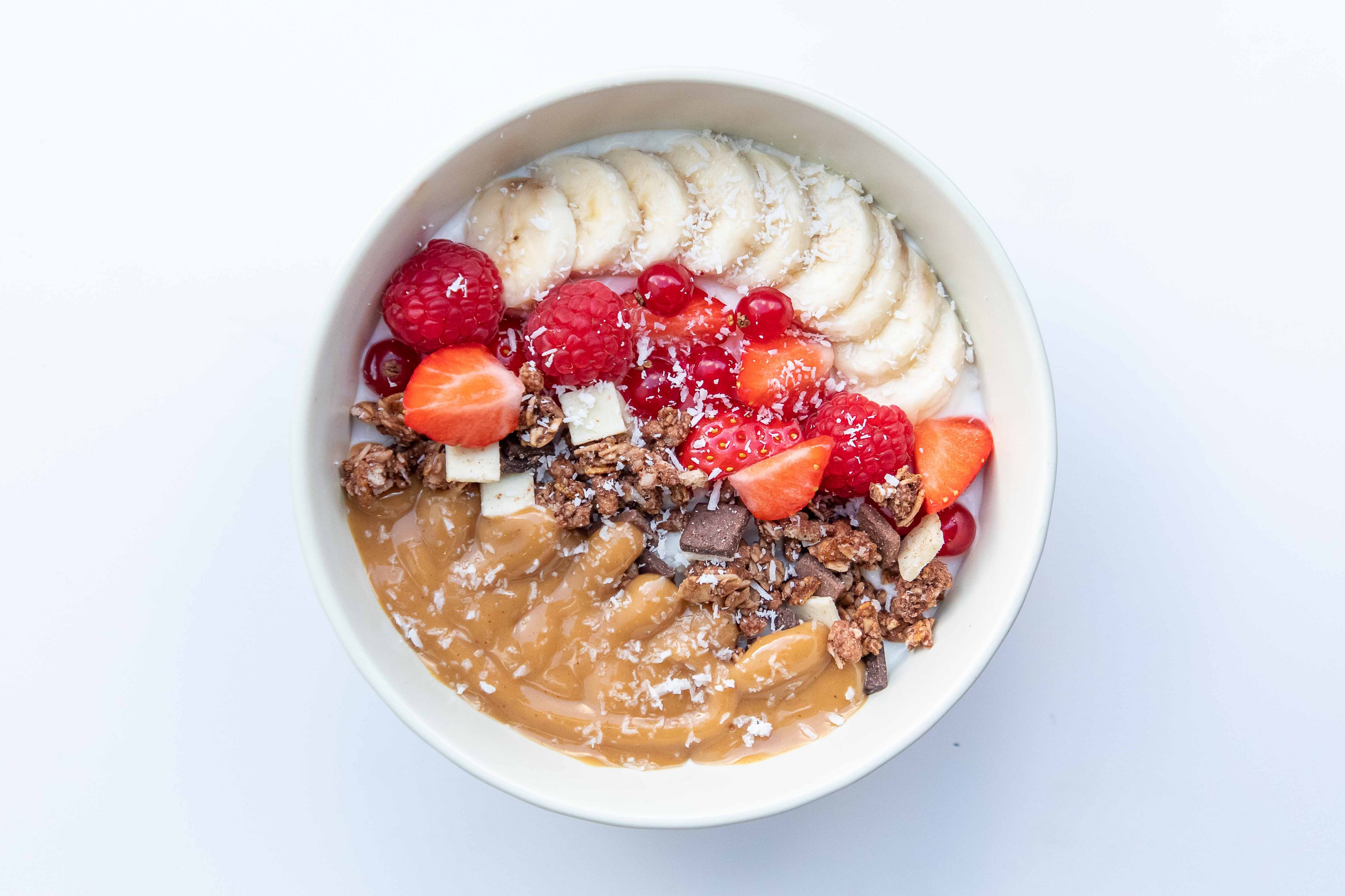 Banana, red fruit, peanut butter, chocolate granola, shredded coconut