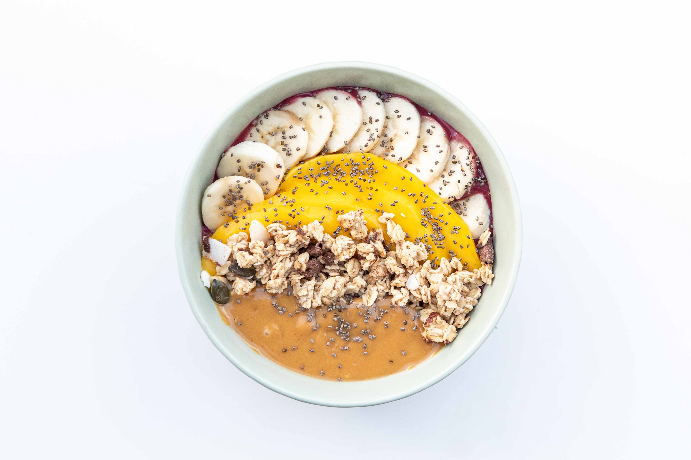 Banana, mango, peanut butter (served on side), chocolate granola
