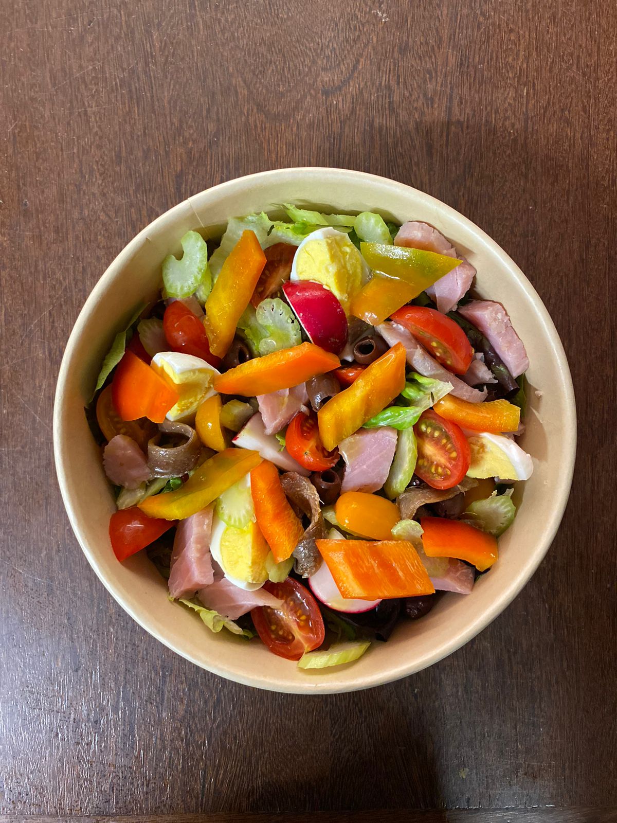 Salade, tomate, thon confit, oeuf dur, anchois, olive, poivron rouge, radis, oignon rouge, céleri