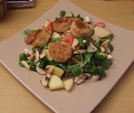 Chèvres panés, miel, salade, tomates, n…