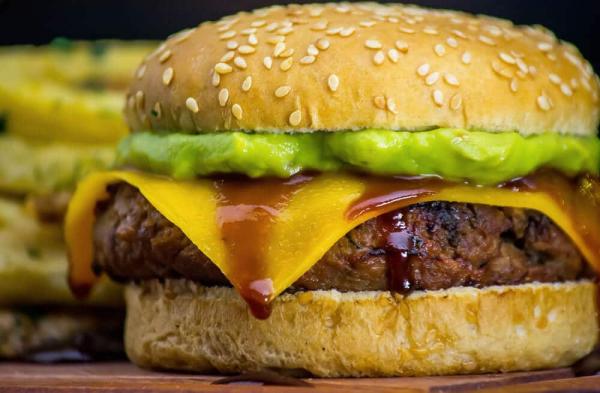 Steak, beans, chedar, guacamole, salade, tomate, oignon, pain burger, cornichon