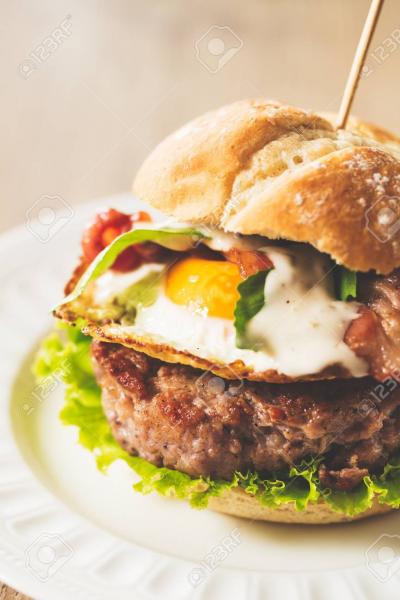 Steak, échalotes, cheddar, oeuf, bacon,…