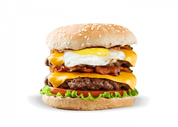 2 Steaks, échalotte, cheddar, oeuf, bacon, salade, tomate, pain burger, cornichon