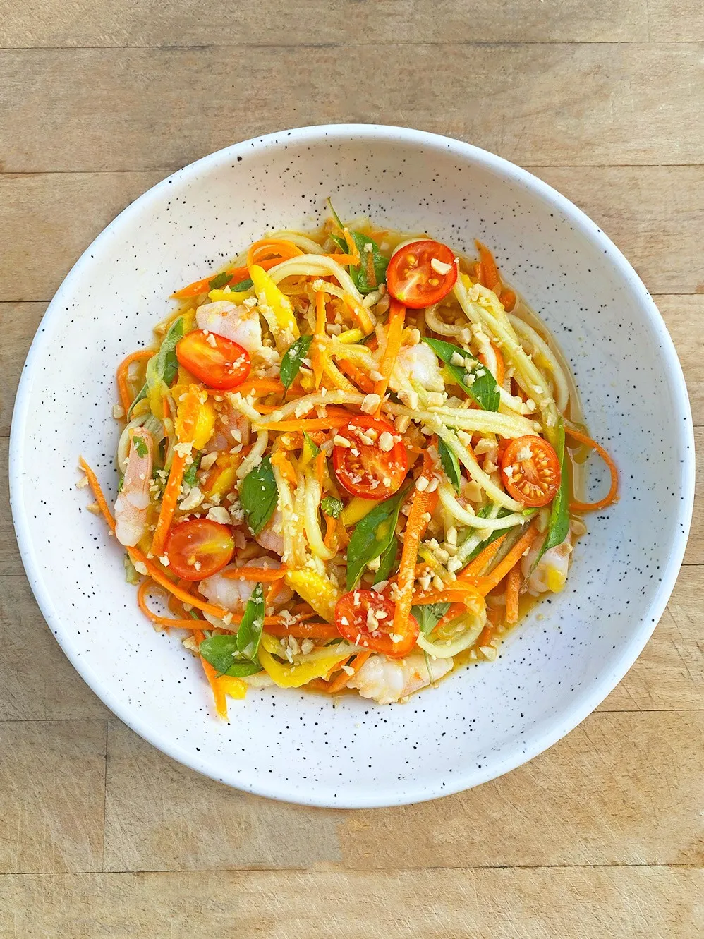 Salade, mix choux rouge / carottes, nouilles, dés de tomates, cacahuètes, coriandre, vinaigrette thaï maison
