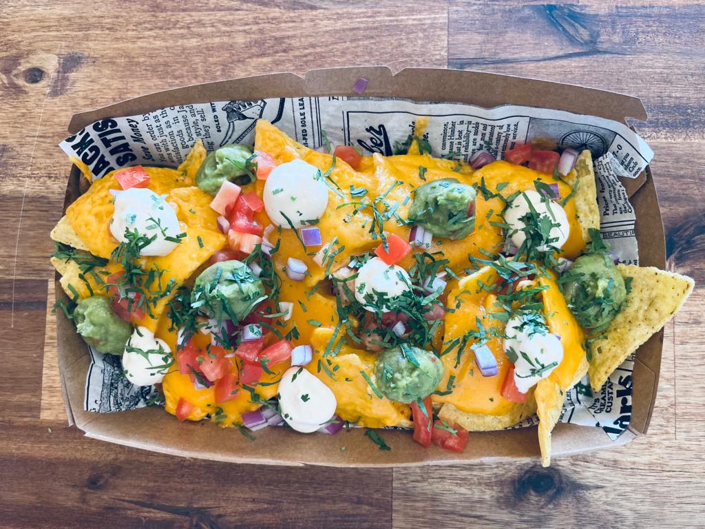 Tortilla chips, cheddar, pico de Gallo, guacamole, crème citron