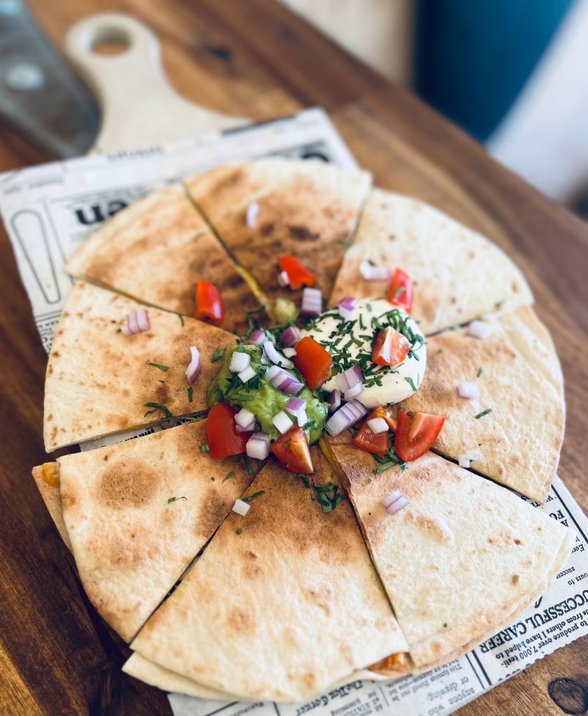 Tortilla de blé, mozza, cheddar, guacamole, crème citron, pico de gallo