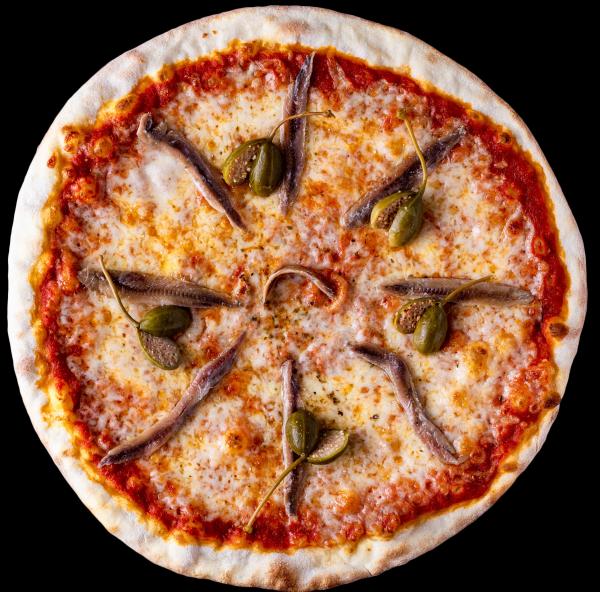 Mozzarella, anchois, câpres, olives, origan