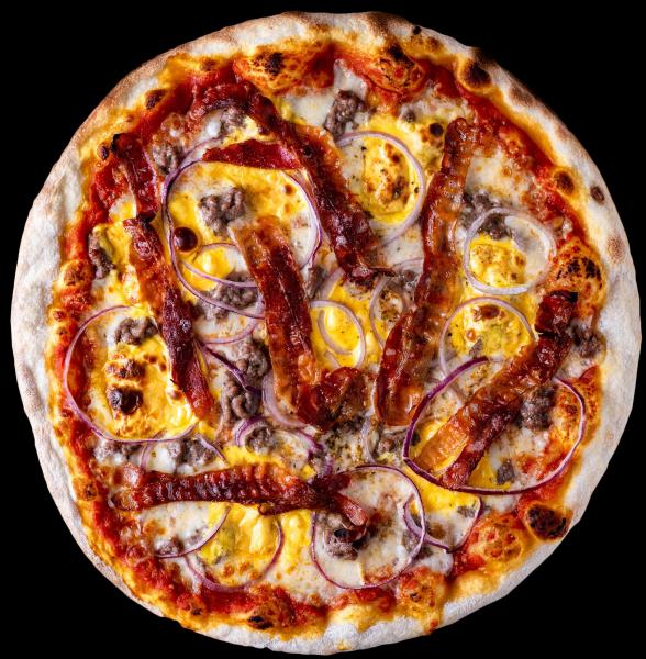 Mozzarella, viande de boeuf hachée, oignons, cheddar, bacon, origan