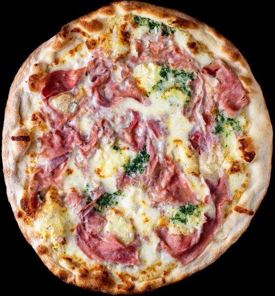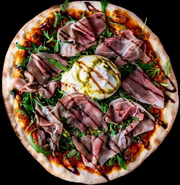 Mozzarella, jambon cru, roquette, pesto, burrata, balsamique, origan