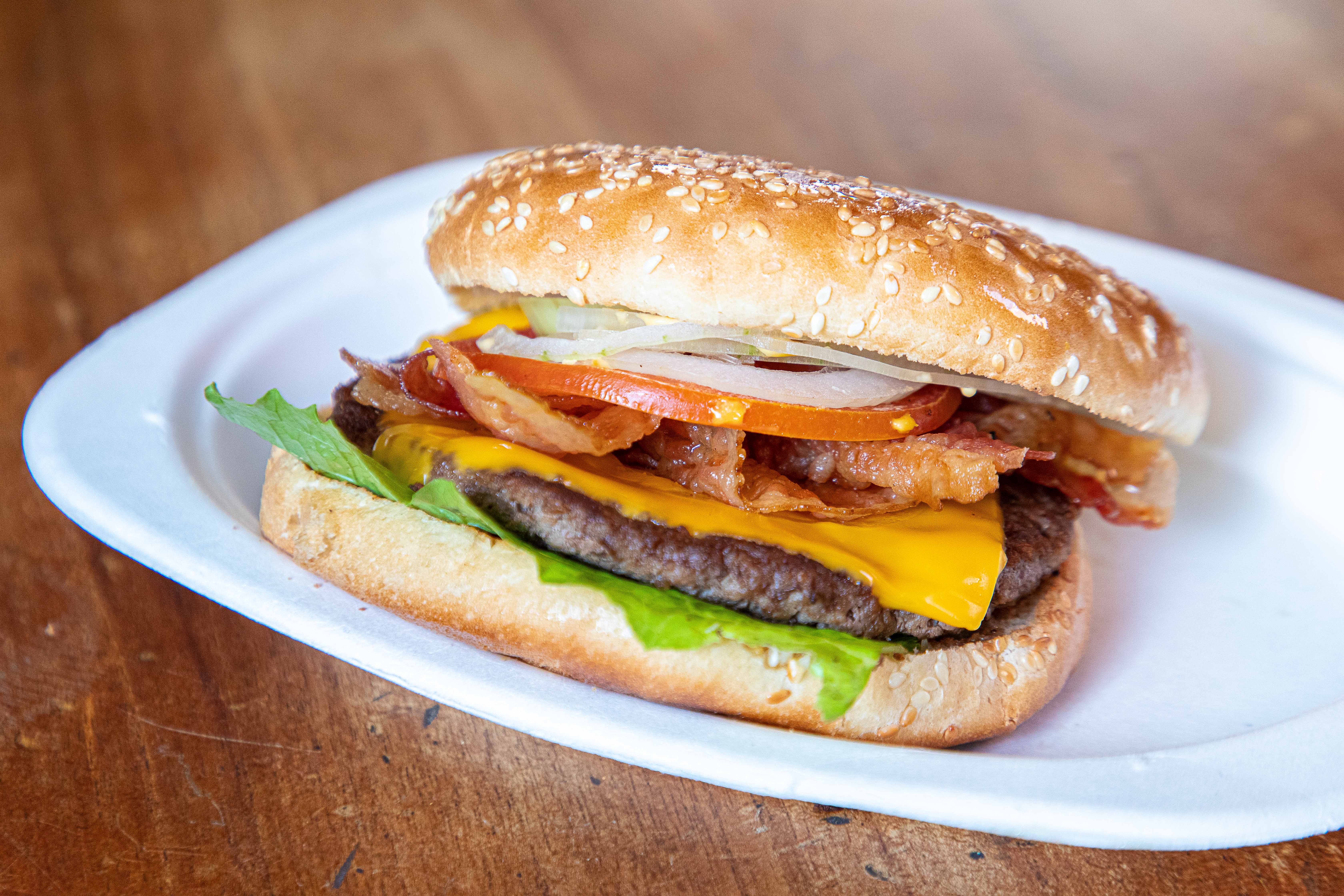 Steak Angus, oignons, tomate, salade, cheddar, bacon
