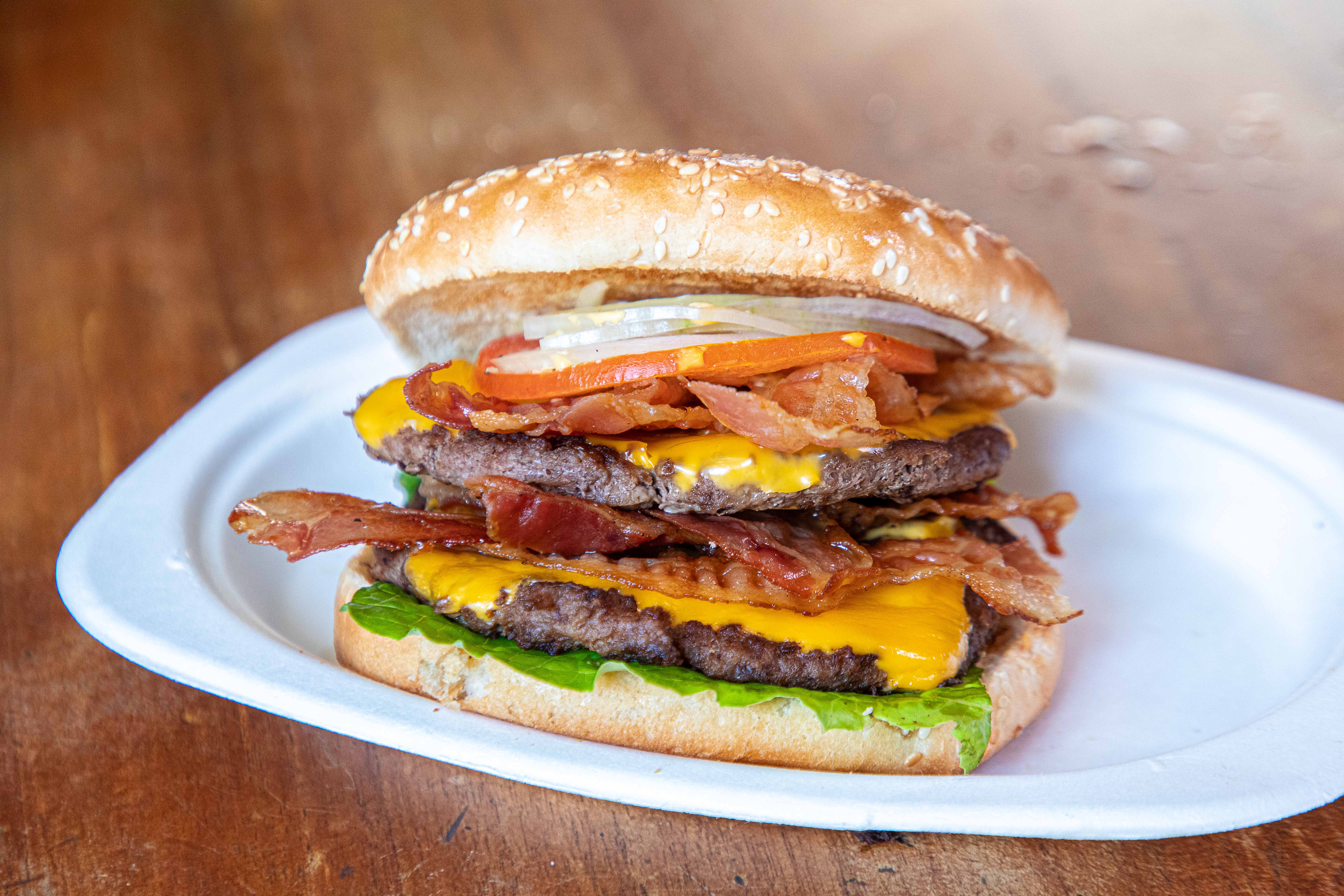 Triple Steaks Angus, oignons, tomate, salade, triple cheddar, triple bacon